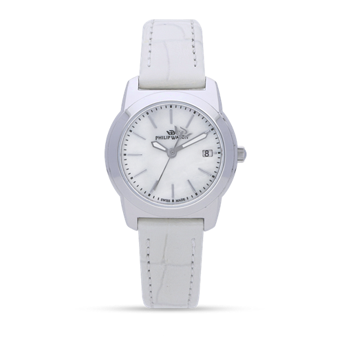 Orologio Philip Watch. Cassa mm 28 in acciaio 316L, cinturino in pelle bianco stampato, fibbia in acciaio. Quadrante madreperla con indici applicati acciaio, datario al 3. Movimento al quarzo RONDA 585. Vetro zaffiro, fondello a pressione. Impermeabilità 3 atmosfere. SWISS MADE