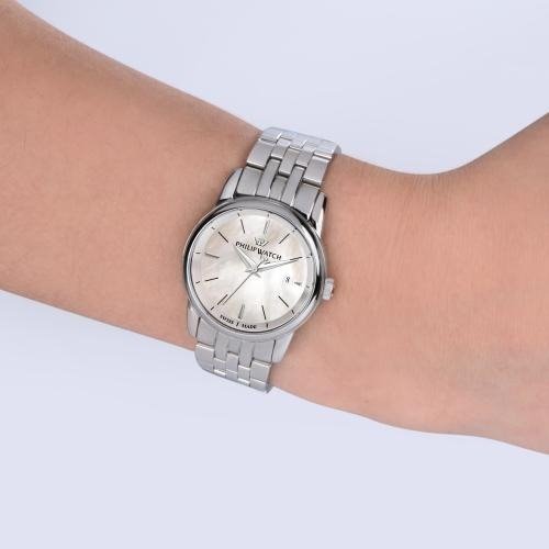 Movimento svizzero Ronda 585,quadrante in madreperla, vetro minerale. Fondello a vite e corona a pressione.