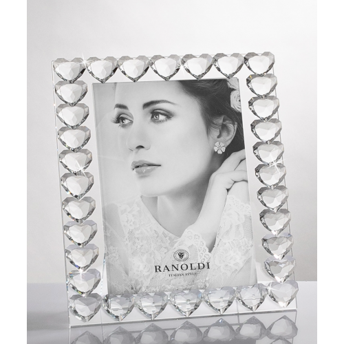 Cornice portafoto in cristallo decorata con deliziosi elementi a forma di cuore. Dimensioni interne foto cm 20x25