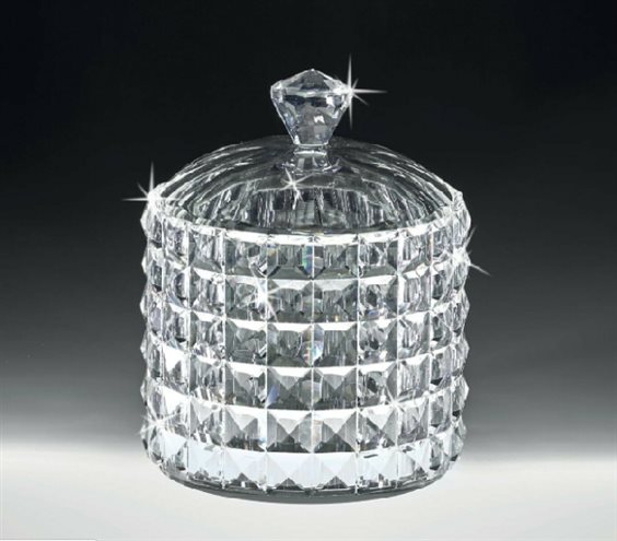 Scatola rotonda in cristallo con coperchio. Dimensioni 17x17x20 cm