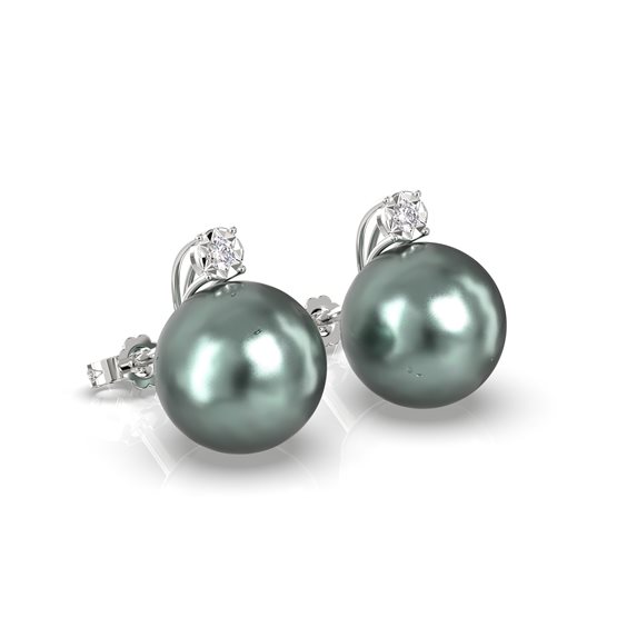 Orecchini in oro bianco 18kt cn perle sferiche Thaitiane colore grigio scuro coltivate in mare e diamante incastonato. Montatura orecchini: perno e farfallina Questo gioiello è accompagnato da certificato fotografico riportante caratteristiche e qualità.