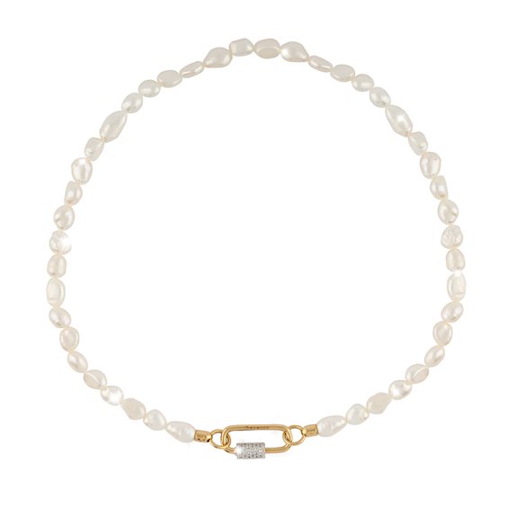 Collana con perle fresh-water e chiusura in bronzo laminato oro giallo con cristalli bianchi.