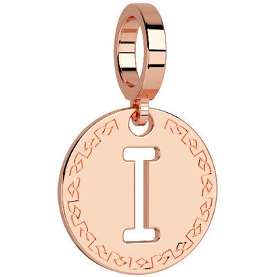 Charm in bronzo laminato oro rosa di forma circolare con lettera dell'alfabeto traforata incorniciata da una greca incisa e logo Rebecca.