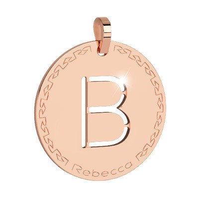 Charm in bronzo anallergico laminato oro rosa, al cui centro è presente una lettera incorniciata circolarmente da un motivo a greca con il logo Rebecca.