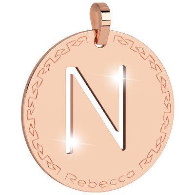 Charm in bronzo anallergico laminato oro rosa, al cui centro è presente una lettera incorniciata circolarmente da un motivo a greca con il logo Rebecca. Diametro pendente cm 3,20
