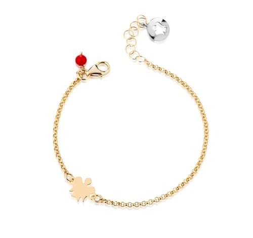 BRACCILE BIMBO/A CON ANGELO IN ORO GIALLO E CORALLO ROSSO CHARM LUNGHEZZA BRACCIALE 14/16 CM ANGELO: BASE 0,7 CM - ALTEZZA 0,8 CM DIAMETRO CORALLO 3 MM