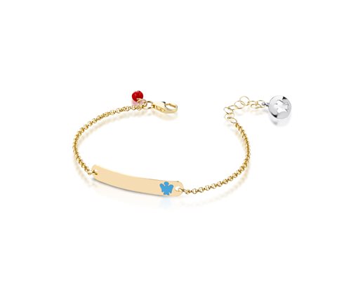 BRACCIALE BIMBO CON TARGHETTA IN ORO GIALLO,ANGELO CON SMALTO AZZURRO E CORALLO ROSSO CHARM, LUNGHEZZA BRACCIALE 14/16 CM, LUNGHEZZA TARGHETTA 2,5 CM, DIAMETRO CORALLO 3 MM
