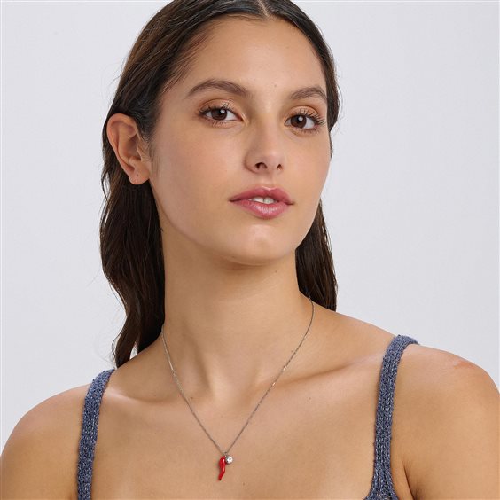 Collana FEELINGS Collana in acciaio 316L con cristallo e pendente a forma di cornetto con smalto rosso. Metalli: Acciaio Pietre: cristalli Finiture: smalti Simboli: Cornetto Misura collana: 470mm Collezione: FEELINGS