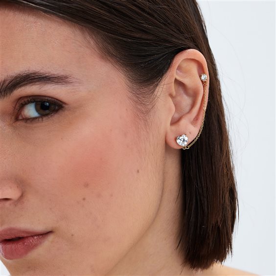 Orecchino DAZZLY SDZ140 Mono orecchino doppio buco con catena in acciaio 316L, finitura pvd oro 14K e cubic zirconia a forma di cuore. Metalli: Acciaio Pietre: zirconi Finiture: oro Simboli: Cuore Misura orecchini: 45mm Collezione: DAZZLY
