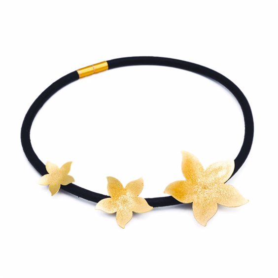 Girocollo in cuoio colore nero con pendente in argento 925 placcato oro giallo puntinato a mano con lavorazione unica nel suo genere. Gli elementi sono fissi e sono a forma di fiori di iris in scala. Chiusura a vite. Made in Italy Peso AU gr 11