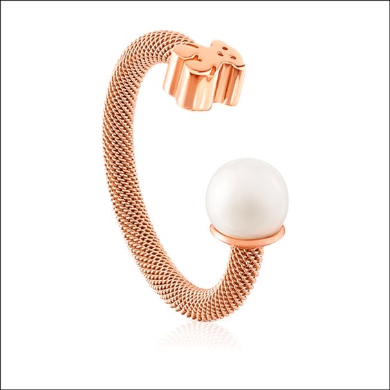 Anello in argento placcato rosè lavorazione mesh con, ad un'estremità, l'orsetto Teddy Bear iconico TOUS e nell'altra estremità una perla bianca naturale coltivata freshwater.