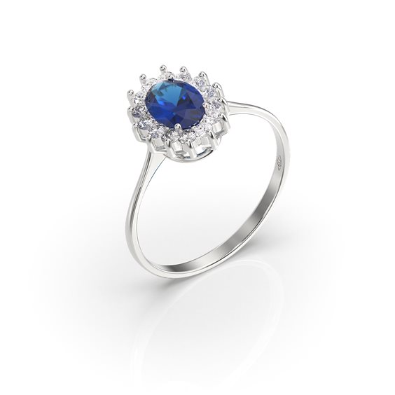 Anello in oro bianco 18kt modello a margherita con zaffiro idrotermale centrale contornato da Diamanti naturali. Questo gioiello è accompagnato da certificato fotografico riportante qualità e caratteristiche specifiche.