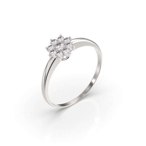Anello in oro bianco 18kt con pavè di Diamanti naturali. Modello Margherita con un diamante centrale e diamanti laterali a contorno. Il gioiello è accompagnato da certificato fotografico riportante qualità e caratteristiche specifiche.