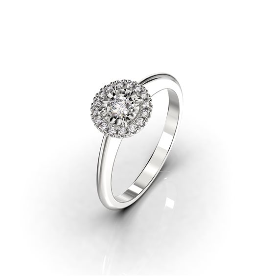 Anello in oro bianco 18kt con pavè di Diamanti naturali. Modello Margherita con un diamante centrale e un contorno di diamanti. Il gioiello è accompagnato da certificato fotografico riportante qualità e caratteristiche specifiche.