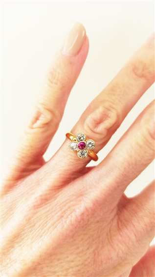 Anello in oro giallo con elemento centrale a forma di fiore. La pietra centrale è un rubino sintetico di colore rosso ed è contornata da quattro zirconi bianchi.
