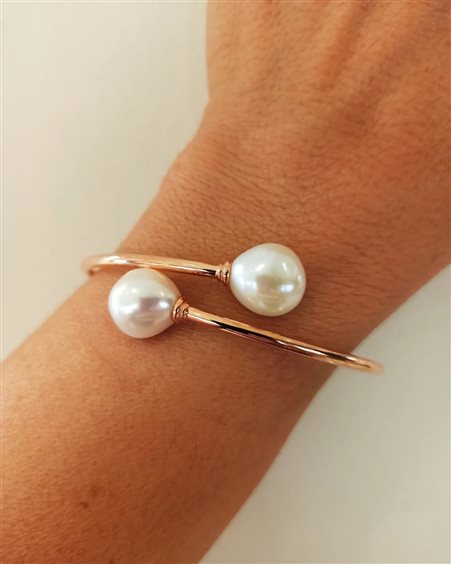 Bracciale BANGLE rigido contrariè in argento 925 placcato oro rosa con due perle bianche naturali di acqua dolce. Il bracciale ha una forma ovale che abbraccia perfettamente il polso e fa in modo che le perle stiano sempre in vista
