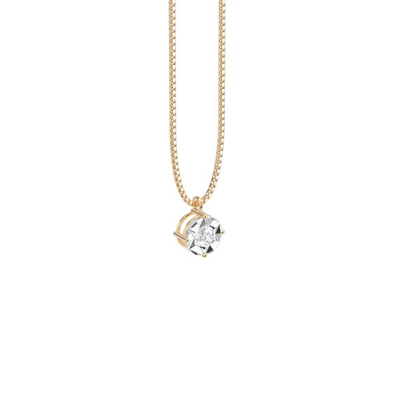 Girocollo in oro giallo 18kt con punto luce pendente. Diamante naturale taglio brillante incastonato con montatura a griffe. Modello catenina: veneziana Il gioiello è accompagnato da certificato fotografico riportante qualità e caratteristiche specifiche.