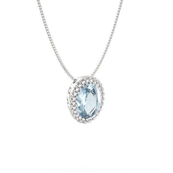 Girocollo in oro bianco 18kt con acquamarina taglio ovale pendente contorno di diamanti. Modello catenina: veneziana con chiusura semplice moschettone Questo gioiello è accompagnato da certificato fotografico riportante qualità e caratteristiche.