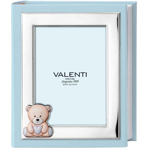 Album fotografico celeste con cornice portafoto in Mirò Silver con orsetto colorato. Dimensioni album cm 23x26 Dimensiona interna foto cm 13x18