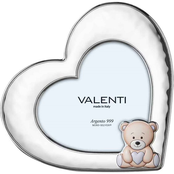 Cornice da bambino a forma di cuore in Mirò Silver con orsetto colorato e retro in legno bianco. Dimensione foto cm 9x13