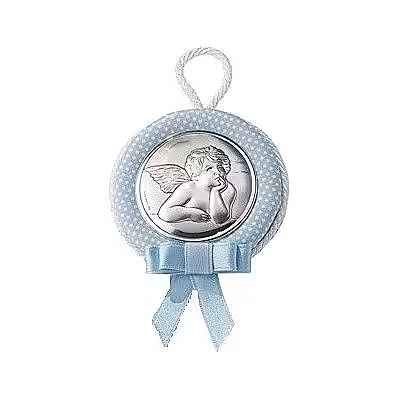Capoculla Argenti Medaglione per culla prima infanzia. Medaglione tondo di colore celeste con icona angelo Raffaello con carillon. La lastra è in argento 925 bilaminato. Le dimensioni sono cm11x11