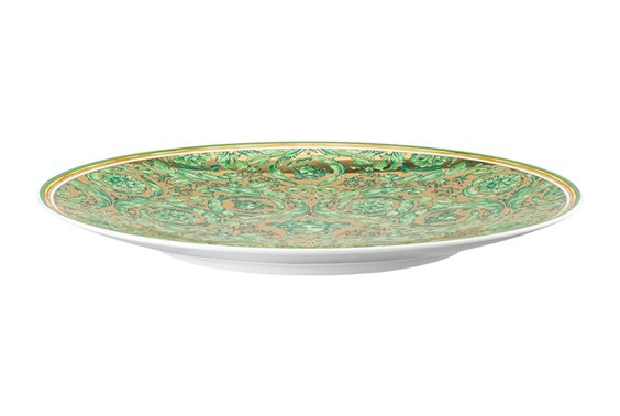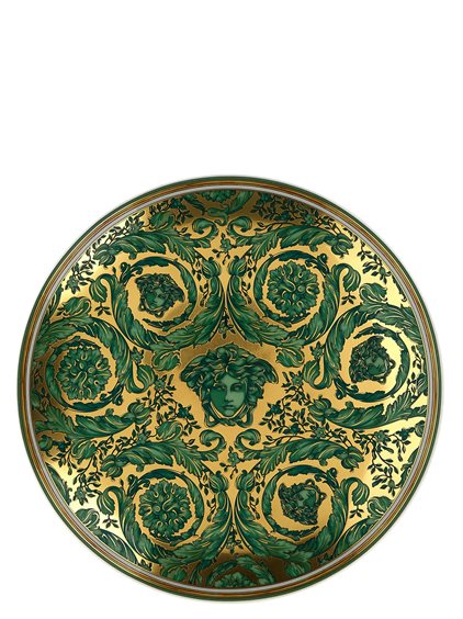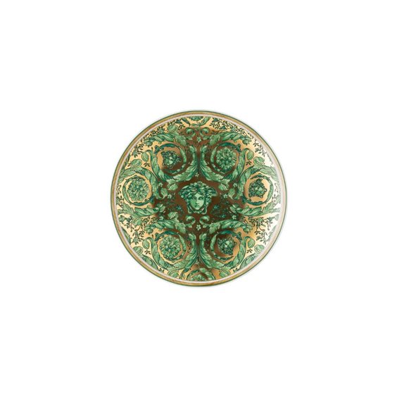 Piatto Medusa Garland 17 cm Parte della collezione Medusa Garland, questo piccolo piatto in porcellana presenta opulenti motivi classici e un emblema Medusa centrale in verde su uno sfondo dorato. La delicata finitura in lamina rende questo articolo soggetto a graffi. Pattern Medusa Garland Adatto al microonde Porcellana